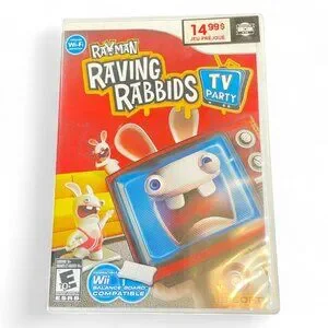 Complete pre-owned copy of Rayman Raving Rabbids: TV Party for Nintendo Wii. Includes the original plastic case with full-color cover art. Compatible with the Wii Balance Board and featuring the Nintendo Wi-Fi and ESRB Everyone 10+ logos. A fun and collectible title that captures the humor and chaos of the early Wii era.