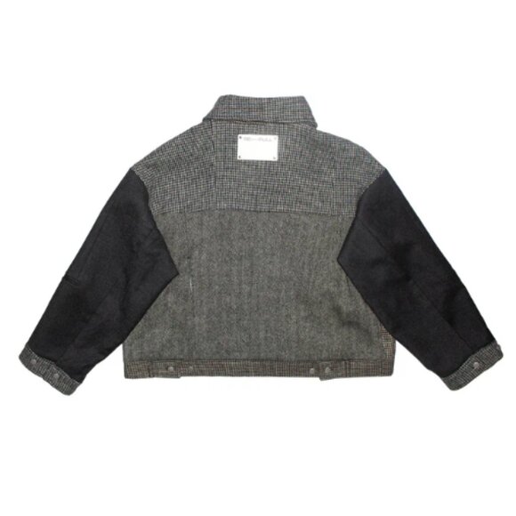 Reinterpretation of the classic trucker jacket crafted from upcycled vintage wool blazers. Boxy cut for a relaxed fit.