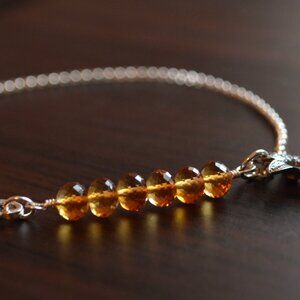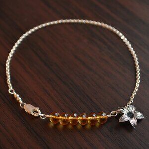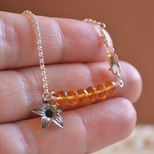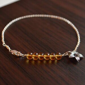 I combined real citrine gemstones with sterling silver to create this piece, made with November birthday girls in mind. The six 5mm gemstones are a beautiful shade of burnt orange, and are accented by a small sterling silver flower charm. The body of the bracelet is a slim rolo chain that is both lightweight and strong. A petite sterling lobster clasp secures the bracelet.