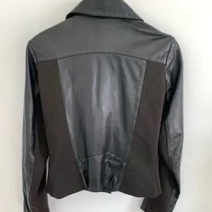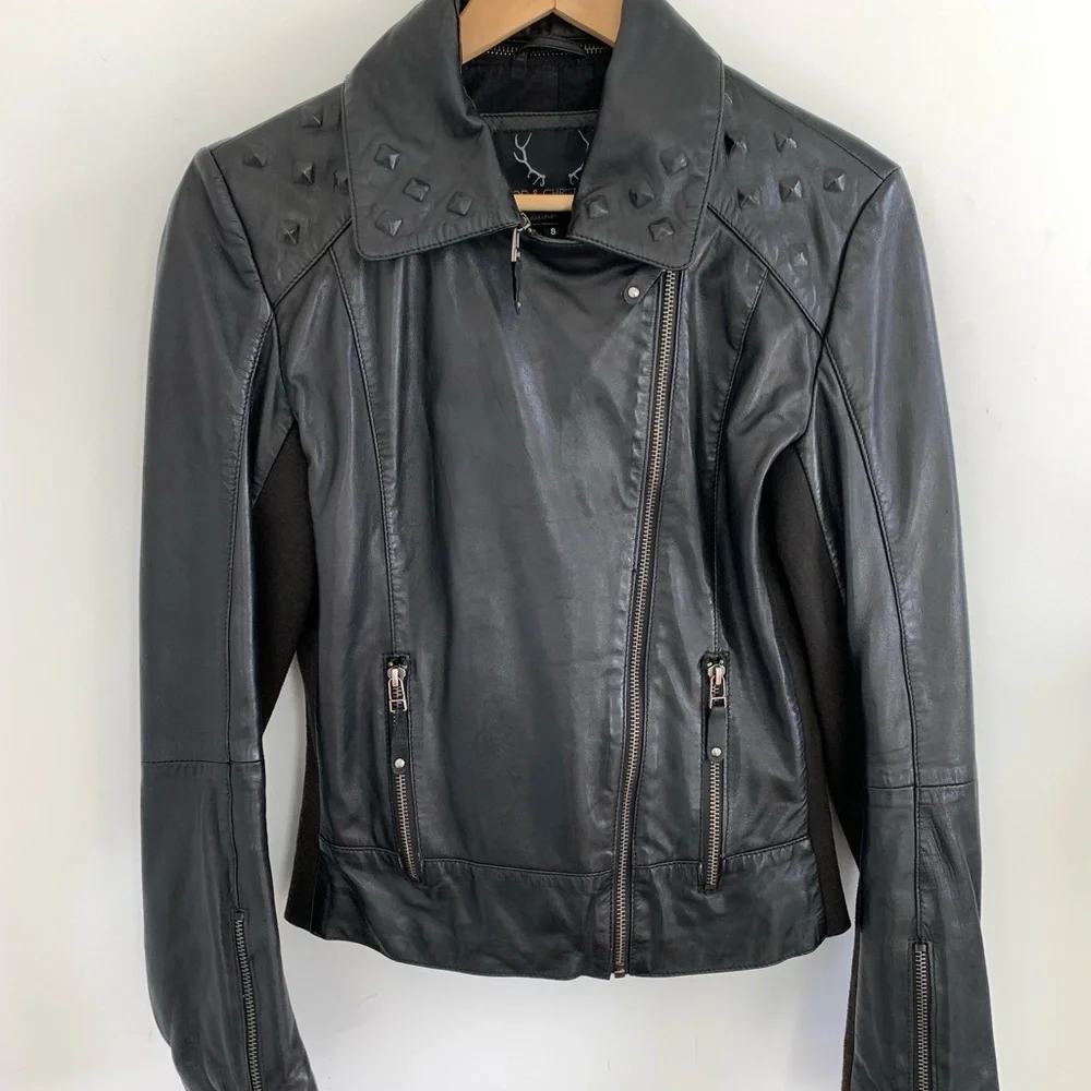 Real leather jacket with studded details and stretch fabric panels for extra comfort. Super soft butter leather. Collar is removable.