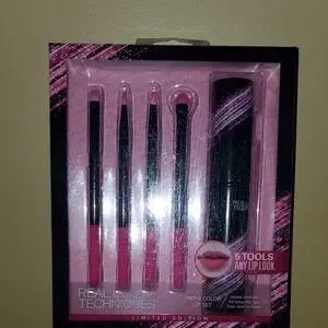 Enhance your lip look with the Real Techniques Prep & Color Lip Set. Includes five essential tools for perfect application. Features a stylish pink and black design.