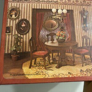Victorian Series Dining Room kit in box with instructions as shown in pictures. Includes hardware, cushion foam, fabric, stickers, furniture, faux marble top sideboard.
