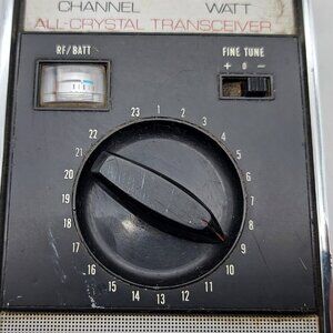 A Realistic TRC-101 Transceiver made in the 1970s for Radio Shack (Tandy Corporation); it is a walky talky. It has 23 channels, a 49" antenna, ports for a phone and microphone, a port for an external antenna, a squelch dial and volume control. It takes 12 AA batteries and seems to be functional. I tested it as far as I could -it turns on, I can hear static on the different channels and the static is interrupted when I hold down the button to speak but I don't have another walky to fully test it with. Without the antenna it is just under 10 1/2" by 3 1/4" by 2 3/8 deep.