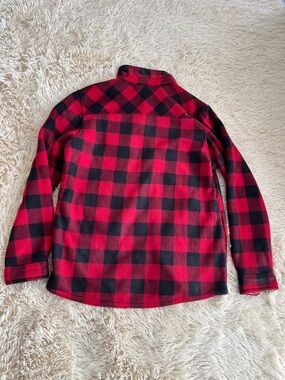 Realtree men's lightweight shirt jacket in bold buffalo plaid. Button-front with dual chest pockets. Soft, cozy fabric ideal for layering. Rugged outdoor style with brand patch detail.