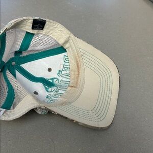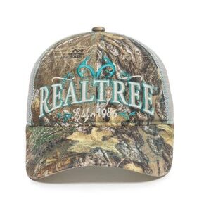 Realtree Camouflage hat featuring white and teal embroidered logo on front in good used condition. SnapBack closure and mesh back. Some marks on inside rim which could come out with a wash. Brand is made by Outdoor Cap. One size fits most.