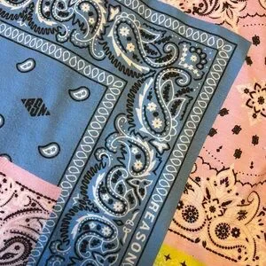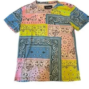 Colorful bandana pattern tee by Reason. Features blue, pink, and yellow designs.