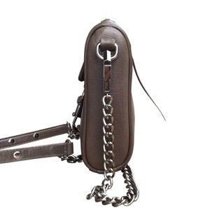 Stylish taupe brown leather crossbody bag with silver accents, interior blue/black leopard pattern fabric and a removable crossbody strap, easily converting the bag to a clutch.