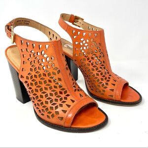 Rebecca Minkoff Laser Cut Peep Toe Orange Leather Block Heel Sandals Size 7.5