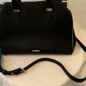 Sophisticated, sleek, and effortlessly timeless – this Rebecca Minkoff satchel is a refined companion for elevated everyday wear. Crafted in textured black Saffiano-style material, the bag features sharp structured lines, elegant top handles, and chic silver corner hardware. The versatile crossbody strap makes it easy to go from hands-free errands to polished office style, while the zip-accented sides add a modern twist. Inside, the bag is clean, well-organized, and just like new.