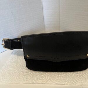 Length of belt 34”. Bag size 6.6” X 4” X 1.6”. Note that bag is small. Color black. Material leather and suede with gold tone studs. Magnetic closure on bag and buckle closure on belt. “REBECCA MINKOFF” brand name engraved on back of bag. New with Nordstrom tag and bar code.