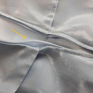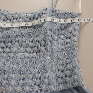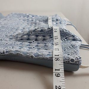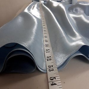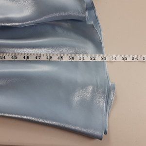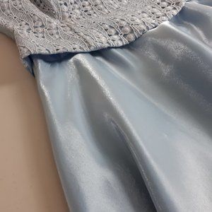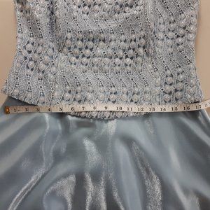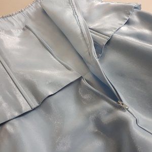 A gorgeous gown in a shimmering light blue shade. It has thin shoulder straps to help keep everything in place. The corset style bodice has an elegant guipure lace overlay and a zipper closure at the back. It’s fully lined for your comfort. Note: As shown in last photo, there’s some loose threads on the zipper that need a quick fix. Overall, it’s in very good condition.