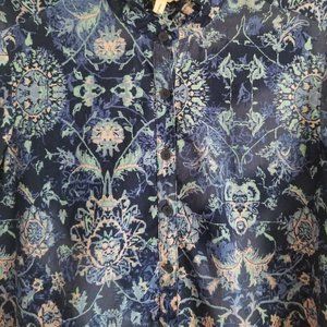 Peasant blouse in a gorgeous abstract floral print! Made from a lightweight cotton fabric. Button closure collar with ruffle neck. Details are well done and the cut is quite slimming.