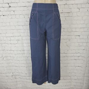 The timeless linen pant is refreshed with unique details for a warm-weather staple that feels fresh. Utilitarian, sailor-inspired references like contrast stitching and button pockets amplify a versatile silhouette. A mid-rise waist and wide cropped leg are contemporary and flatter universally. Zip closure at left side.