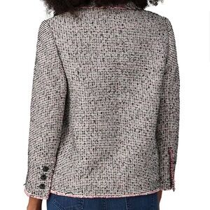 Elevate your wardrobe with this luxe tweed jacket by Rebecca Taylor, designed with chic pops of magenta & black for a modern twist on a timeless silhouette