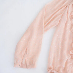 Introducing the Rebecca Taylor Peach Silk Polka Dot Metallic Tie Neck Ruffle Long Sleeve Blouse, an exquisite addition to your wardrobe that perfectly blends sophistication and charm.