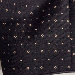 A lovely fitted, feminine jacket in black with a gold dot pattern. It's in great condition except for two tiny snags on the sleeve -- visible in the close up photos but hard to spot as the lining is also black.