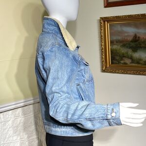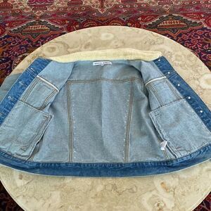 In excellent preowned condition, practically new, gorgeous Rebecca Minkoff Clark Denim Jacket. Featuring a plush shearling collar and subtle studs that add signature Rebecca Minkoff style to this vintage-washed denim jacket. Two buttoned chest pockets plus side slit pockets, buttoned cuffs and a beautiful lightly fitted cut.