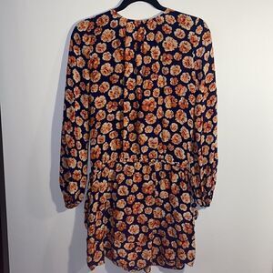 A beautiful day to evening dress in a fresh orange and navy floral print features pleat details and covered buttons down the front with side drawstrings to adjust fit. The mini length and tunic style allow this dress to transform - wear it over leggings or bare legs.