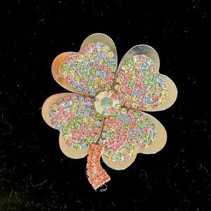 Rebekah Price Lucky Clover Silver and Multicolour Swarovski Crystal Brooch. Silver and Swarovski perfection in this lucky clover brooch by Rebekah Price! Crystal clear centre Swarovski crystal anchors four leaves of blue, pink, green, and yellow dot-dot crystals with a pink crystal stem, seemingly floating in front of a silver four-leaf base. Wear on a hat, a jean jacket, a favourite coat or purse - and bring a little luck to your day!
