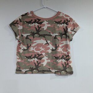 Rebel Rogue Camo Print Crop Tee with Asymmetrical Collar Pink Beige Size Large