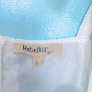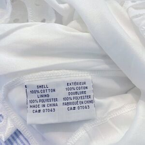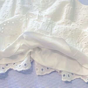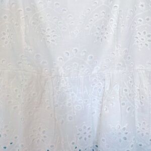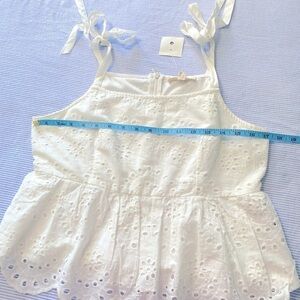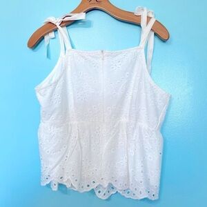 Sleeveless top woven cotton fabric with eyelet embroidery. Lace trim and tie-top shoulder straps and gently flared peplum.