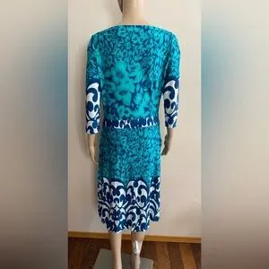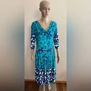 Blue Floral Midi Dress. Cowl Neck. 2” Contrast Band at Waist. Side Pockets 95% Polyester, 5% Spandex Size Large 45” Length 36” Bust 30” Waist 12.5” Sleeve