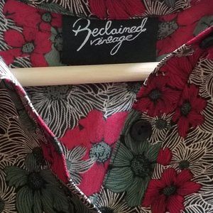 Cute tunic top from ASOS Reclaimed Vintage line, size US 8, UK 12 or EU 40. Pit to pit measurement is 20 inches, no stretch to top. Floral pattern in burgundy, black, beige and green with collar and buttons to bust line. Great condition. Reclaimed Vintage is an initiative by ASOS to source and use vintage fabrics. Quality and colours are awsome... and good for the environment.