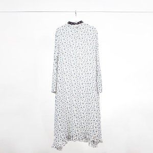 Edgy yet feminine maxi dress with a white base and blue ditsy floral print. The black grosgrain ribbon around the neck has silver studding detail and an elastic button closure. There is a ruffle hem and the dress falls loose on the body.