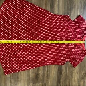 This charming red dress features a classic A-line silhouette with a V-neck and raglan short sleeves, perfect for casual or work settings. The lightweight fabric drapes beautifully, offering a relaxed and comfortable fit. The white polka dot pattern adds a touch of timeless elegance to the overall design.