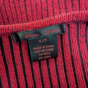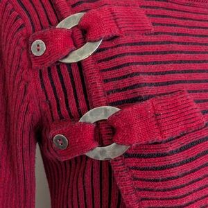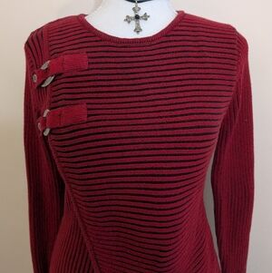 Red and black striped asymmetrical sweater with silver buckle detail.