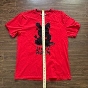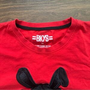 Red BKYS t-shirt with a black bunny graphic and 'Lucky Charm' graphic.