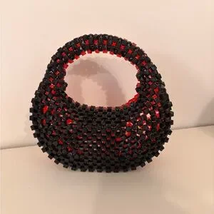 Stylish red beaded handbag with a black handle. Perfect for adding a pop of color to any outfit.