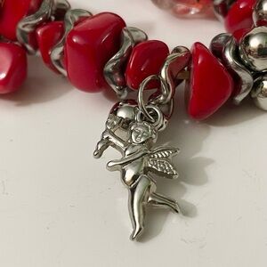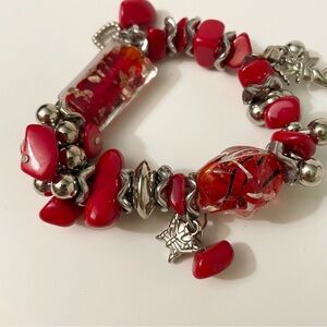 Red Beaded Stretch Bracelet Silver Tone Charms