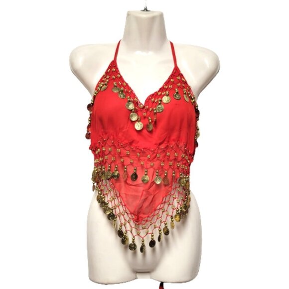 Red Belly Dancing Top Crocheted with Gold Beads Coins Halter Crop Top - NEW !