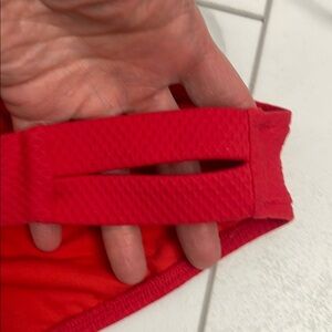 Stylish and vibrant red bikini bottom with detail on hip. Perfect for summer or tropical vacations. Enjoy comfort and style at the beach or pool. In great condition, only worn a few times.