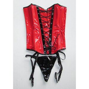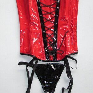 Red Black Lace Up Front Shiny Vinyl Corset Set - NEW