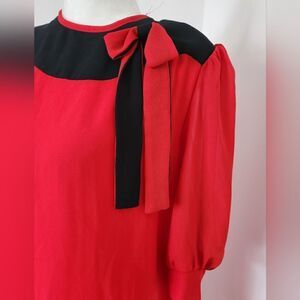 Red & Black 80s Vintage Joseph Ribkoft Pleated Puff Sleeve Drop Waist Dress