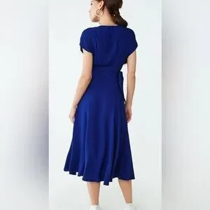 Lightweight comfortable fabric drapes softly for an elegant silhouette. Short sleeves and a defined waist create a polished, versatile look.