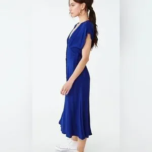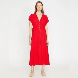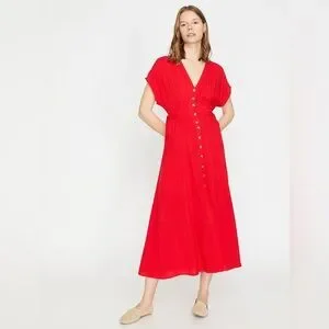 Chic red midi dress with a flattering V-neck and button-front detail. Side tie details.