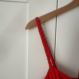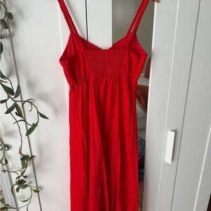 Sleeveless red maxi dress with adjustable straps. Front button closure down the length. Lightweight, flowy silhouette. Bright solid red color.