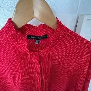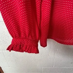 Jasmine and Juliana. Stylish red button-up blouse with ruffled collar and cuffs. Red and white polka dots. Polyester.