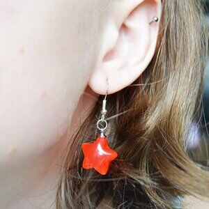 Adorable red star dangle earrings made with hypoallergenic (no nickel or alloy) silver hooks! The semi-translucent red colour makes the star look almost like candy. Lightweight and good for all-day wear.