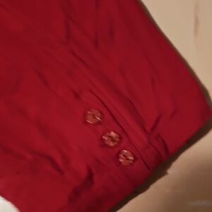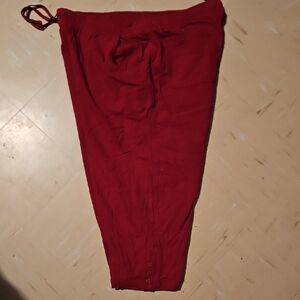 Comfortable and stylish red capris perfect for any casual occasion. Enjoy a relaxed fit with an adjustable drawstring waist. Side and back pockets. button detail at leg bottoms. 100% cotton