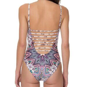 Sultry, strappy openwork shows off hints of skin all around this matte-pastel maillot.