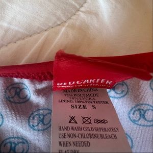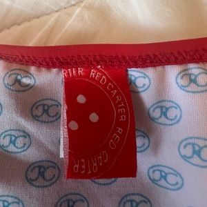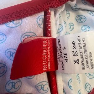 Red Carter bikini in a gorgeous summer shade of red. Tie halter top with removable pads in the bust. Pull-on bottoms. Cute leaf-like appliqué detail. Worn once or twice. Great used condition. Size small. Perfect for summer and/or that tropical vacation!