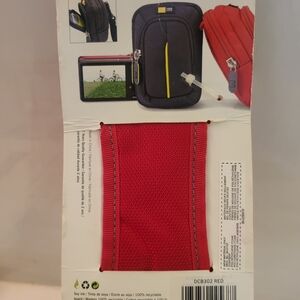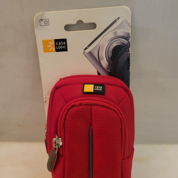 red compact camera case. Protects small cameras and accessories with padded construction. Features front zip pocket and secure zipper closure. Lightweight and portable for travel and everyday use.