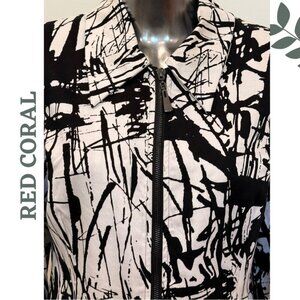 Turn heads in this eye-catching Red Coral abstract print jacket featuring a black and white splatter-style design. This zip-up, lined piece blends comfort with a bold artistic edge. The lightweight longline silhouette makes it ideal for transitional seasons—perfect for layering over basics or pairing with monochrome outfits to let the pattern pop. A go-to for gallery days, city strolls, or bold everyday style.