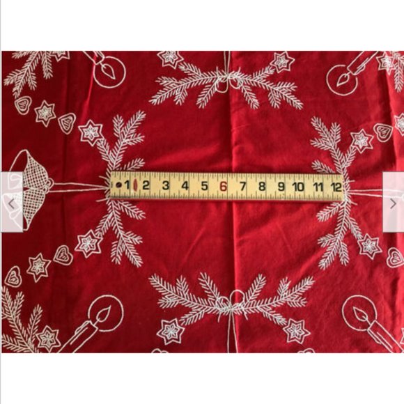 Red cotton tablecloth with white embroidered holiday/Christmas/winter design. Machine embroidery along all 4 edges. Approx. 35" square.
