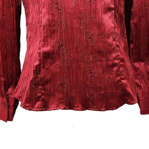 Vinrage to early 2000's. Red shiny crinkled and embroidered blouse by Penmans. Embroidered with whimsical paisley in red thread. Silky Polyester fabric. Size Medium. Lovingly preloved excellent condition, only worn once. 20 inches pit to pit. Deep rich red darker than it photographs. Very Elegant