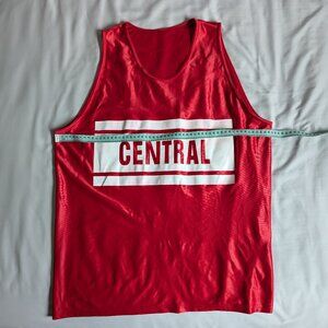 Red shiny, silky dazzle tank top reading "CENTRAL".